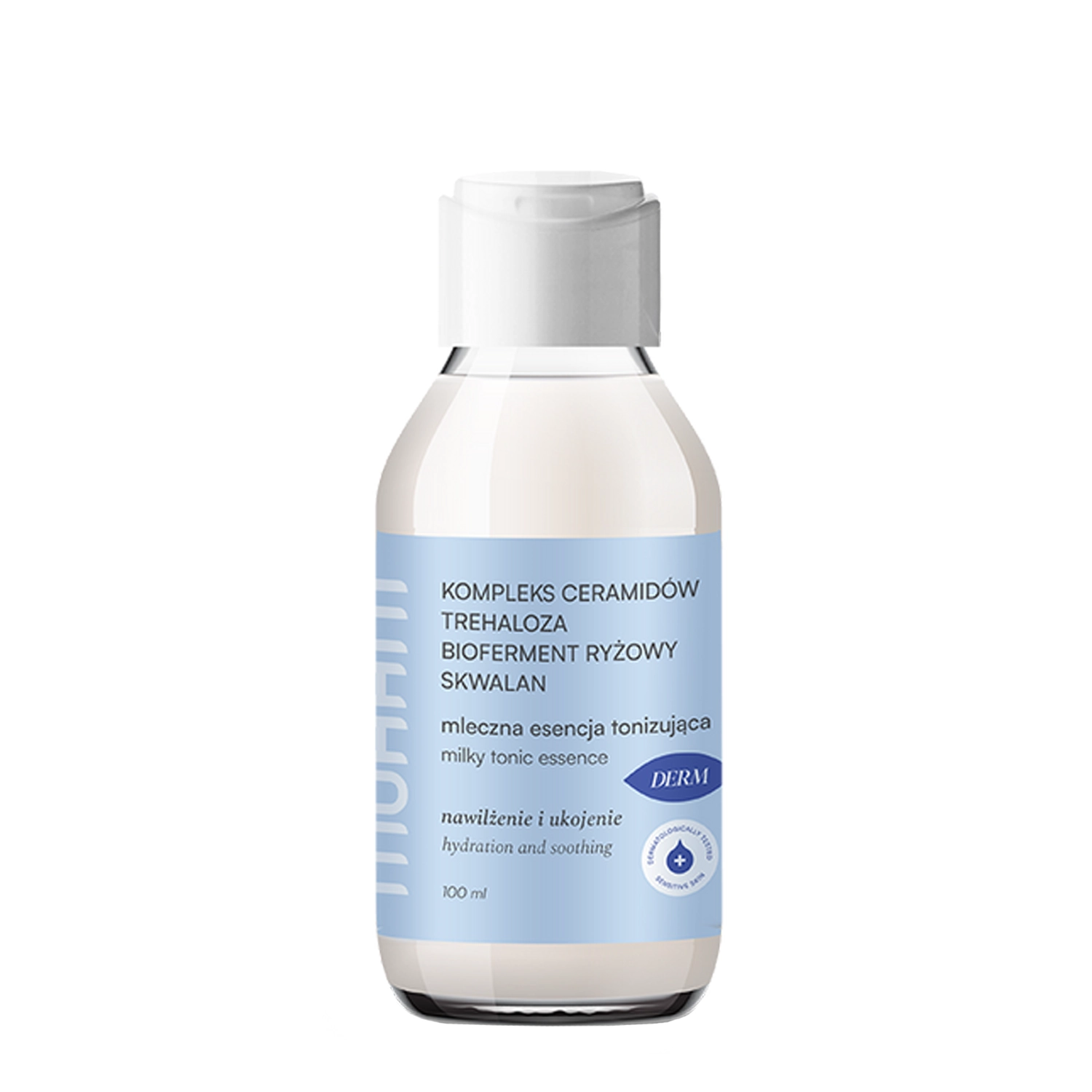 Tonizuojanti esencija veido priežiūrai, pasižyminti lengva, pienine konsistencija