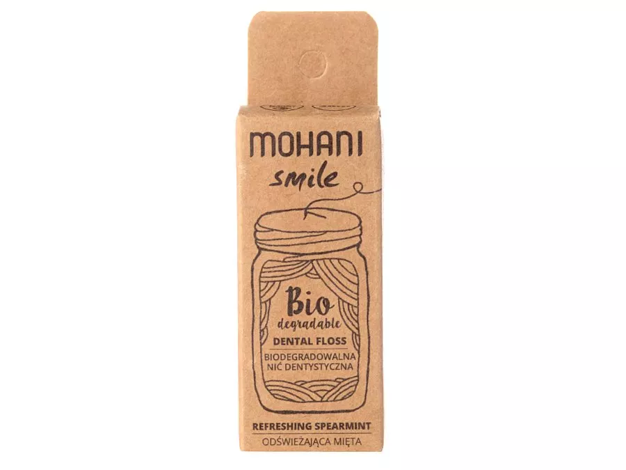 Mohani - Smile - Dental Floss - Biodegradowalna Nić Dentystyczna - Odświeżająca Mięta - przyjazna dla środowiska alternatywa dla tradycyjnych nici dentystycznych z tworzywa sztucznego. Całkowicie naturalna, biodegradowalna nić dentystyczna delikatnie, a jednocześnie skutecznie czyści przestrzenie między zębami. Po zużyciu ulega degradacji, nie szkodząc naszej planecie. Wykonana jest z włókna kukurydzianego zamiast z jedwabiu, co czyni ją w 100% odpowiednią dla wegan. Produkt został ponadto wzbogacony o olejek miętowy, nadający odświeżający smak. Szklane opakowanie nadaje się do ponownego użycia. Po wyczerpaniu się nici dentystycznej możesz kupić tylko opakowanie uzupełniające. Metalowa zakrętka słoika posiada praktyczny dozownik, ułatwiający odcięcie pożądanej długości nici.