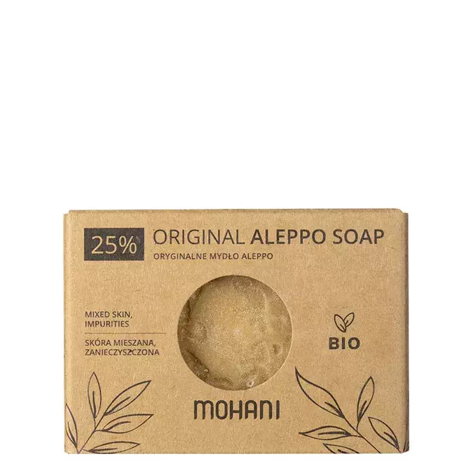 Mohani - Bio - Original Aleppo Soap 25% - naturalne mydło tradycyjne w kostce wyprodukowane w Syrii. Z chemicznego punktu widzenia jest to produkt reakcji tłuszczy z wodorotlenkiem sodu. Z tego względu w składzie mydła są obecne naturalne tłuszcze roślinne: oliwa z oliwek i olej laurowy oraz wodorotlenek sodu. Oliwa z oliwek tak samo jak i olej laurowy mają właściwości oczyszczające. Skutecznie usuwają brud z powierzchni skóry, a jako substancje lipidowe kondycjonują i odżywiają ją. Olej laurowy ma dodatkowe właściwości antybakteryjne, a jego zawartość w produkcie wynosi 25%, co sprawia że mydło może być odpowiednie do codziennego rytuału mycia i odkażania rąk.