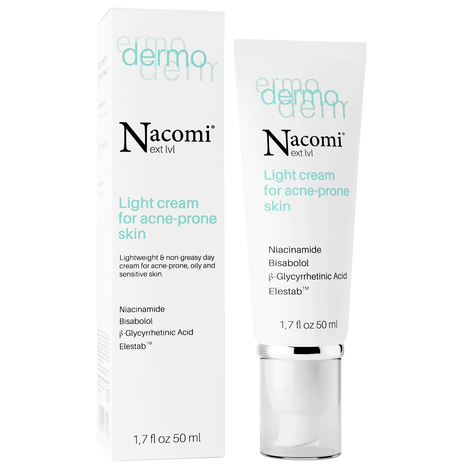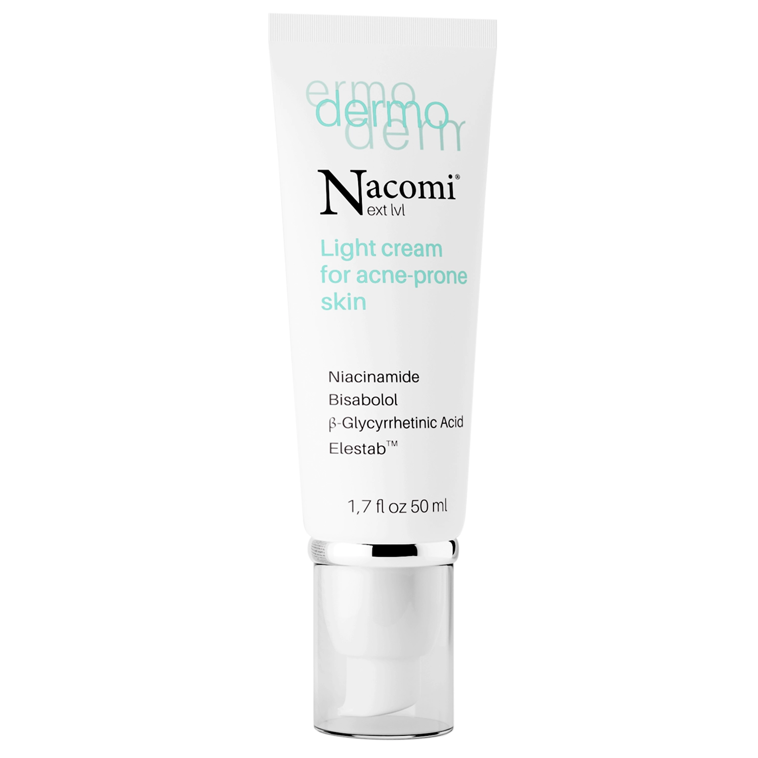 Nacomi - Dermo - Lengvas Kremas nuo Spuogų - lengvos tekstūros kremas, skirtas odos, linkusios į odos trūkumus, poreikiams patenkinti. Jo sudėtyje yra niacinamido, reguliuojančio sebumo išsiskyrimą ir malšinančio uždegimą, itin drėkinančios trehalozės ir bisabololio, apsaugančio nuo sudirgimų. Be to, sudėtyje yra pieno rūgšties, atsakingos už antibakterinį poveikį, kuris itin svarbus į aknę linkusios veido odos priežiūrai. Priemonė padeda mažinti odos netobulumus, jos sudėtyje yra natūralios kilmės ingredientų.