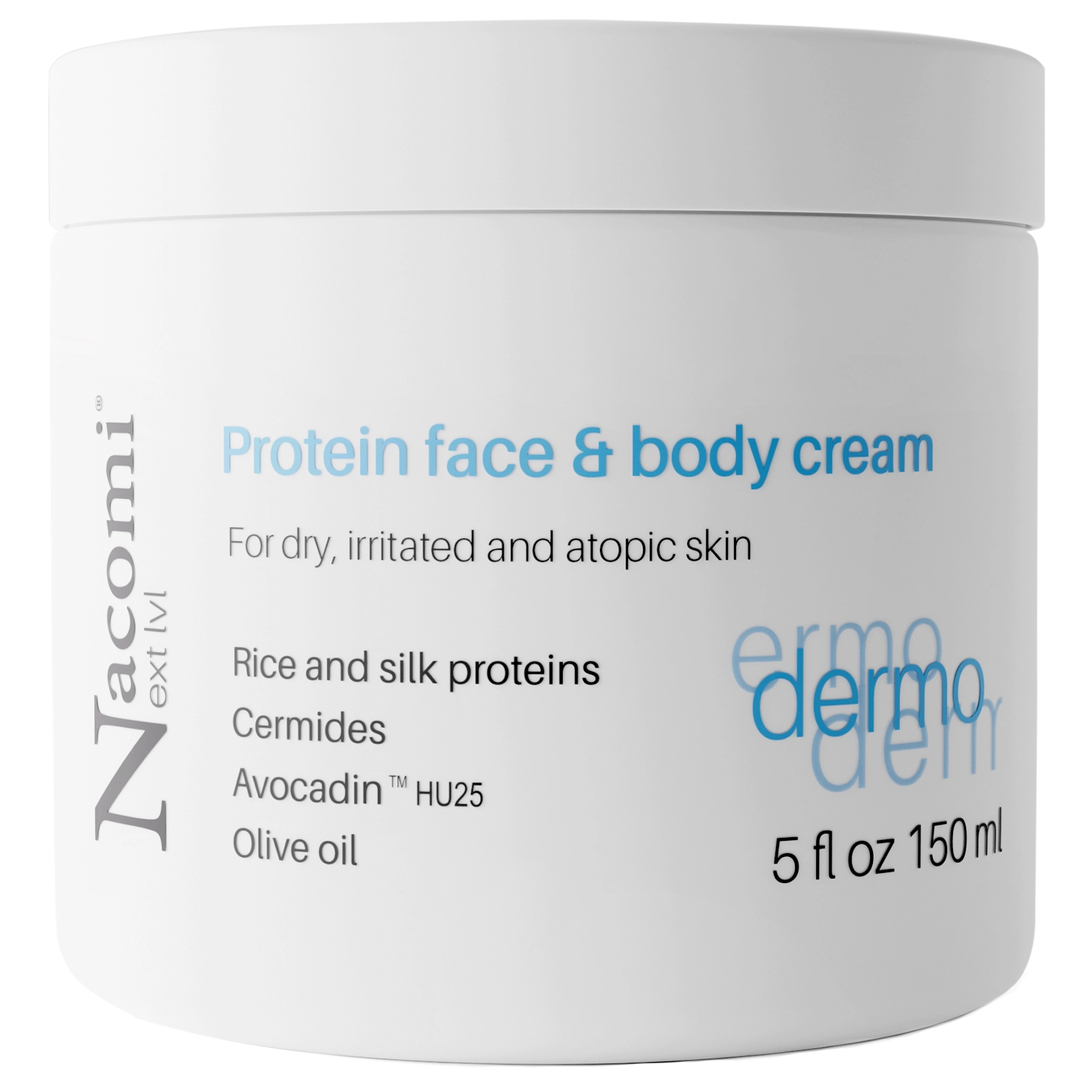 Nacomi - Dermo - Baltyminis Veido ir Kūno Kremas Atopinei, Sausai ir Sudirgusiai Odai - kremas labai jautriai veido ir kūno odai, įskaitant atopinę ir sausą odą. Jo sudėtyje yra švelnaus alyvuogių aliejaus ir taukmedžio sviesto, kurie sutepa odą ir apsaugo ją nuo vandens netekimo. Be to, keramidai ir hidrolizuoti baltymai turi atkuriamąjį poveikį pažeistam hidrolipidiniam barjerui, todėl kremas veiksmingai ir ilgai drėkina odą. Sudėtyje taip pat yra raminamųjų ingredientų ir priešuždegiminių, tokių kaip niacinamidas, alantoinas ir vitaminas E. Be to, ji sudaryta iš natūralios kilmės žaliavų.