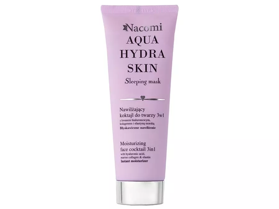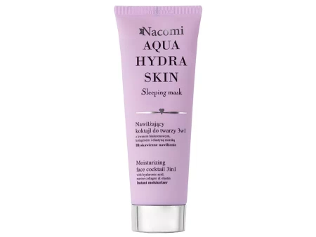 Nacomi - Aqua Hydra Skin - Sleeping Mask - Momentinis Drėkinimas - 3-in-1 Drėkinamasis Veido Kokteilis - drėkinamoji kreminė kaukė sausai odai. Į kokteilio sudėtį įeina saldžiųjų migdolų aliejus ir sacha inci aliejus, kurie rūpinasi tinkamu odos tepimo lygiu, maitina ją ir todėl ji tampa minkšta ir elastinga. Pridėtas pantenolis ramina ir palengvina bet kokius sudirgimus, o vitaminas E pasižymi stipriu antioksidaciniu poveikiu. Produktą galima naudoti kaip kaukę, naktinį kremą arba serumą. Jis palieka odą švelnią ir glotnią, todėl puikiai tiks prieš "didįjį vakarą". Visa formulė pagrįsta natūralios kilmės žaliavomis.