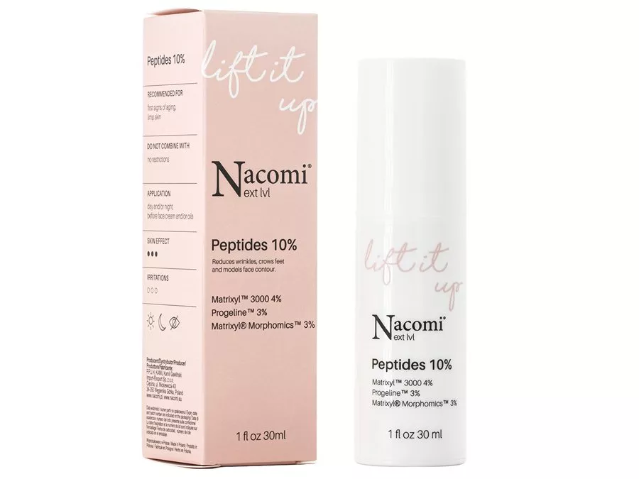 Nacomi - Next Level - Peptides 10% - Liftinguojantis Serumas su Peptidais 10 % - stangrinamasis ir liftinguojantis serumas brandžiai odai. Jo sudėtyje yra gausybė peptidų, tokių kaip Matrixyl™ 3000, Matrixyl® Morphomics™, Progeline™, Fision® WrinkleFix, kurie stimuliuodami kolageno ir elastino gamybą stangrina ir suteikia elastingumo suglebusiai odai, todėl pagerėja odos ovalas ir sumažėja raukšlių matomumas. Serumas stangrina ir drėkina, todėl idealiai tinka vakaro priežiūrai, taip pat ryte prieš tepant makiažą. Visa formulė sudaryta iš natūralios kilmės žaliavų.