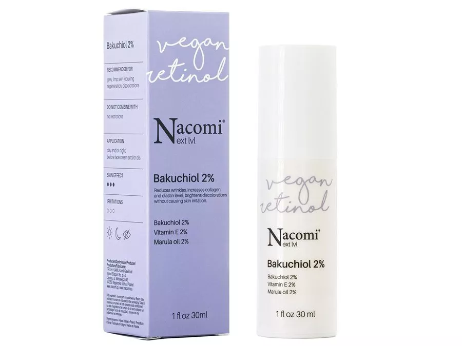 Nacomi - Next Level - Bakuchiol 2% - Serumas su Bakučioliu 2% - senėjimą stabdantis aliejinis serumas su bakučioliu, kuris yra augalinė alternatyva retinoliui, pasižymi senėjimą stabdančiu, lyginamuoju poveikiu ir išlygina odos tonusą, nesukeldamas sudirgimų. Produkto pagrindą sudaro saldžiųjų migdolų ir sojų pupelių aliejai, kurie odos paviršiuje sudaro apsauginę plėvelę, saugančią odą nuo išsausėjimo ir gerinančią jos elastingumą. Vitaminas E papildomai kovoja su laisvaisiais radikalais, o marulų aliejus maitina ir gerina epidermio regeneraciją. Serumas ne tik užkerta kelią senėjimo procesams, bet ir mažina esamų linijų ir raukšlių išvaizdą, kovoja su spalvos pakitimais ir normalizuoja odos būklę. Visa formulė sudaryta iš natūralios kilmės žaliavų