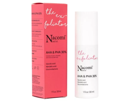 Nacomi - Next Level - Serumas su 30 % AHA ir PHA Rūgščių Kompleksu - sudėtyje yra AHA rūgščių, tokių kaip glikolio, migdolų, citrinų, vyno, kurios veikia keratolitiškai, reguliuoja riebalinių liaukų veiklą ir šviesina odos spalavos pakitimus, ir PHA rūgščių, tokių kaip pieno, laktobiono, gliukonolaktono, kurios švelniai šveičia, be to, turi drėkinamąjį poveikį. Be to, alijošiaus sultys ramina, švelnina ir drėkina, o hialurono rūgštis Sodium Hyaluronate pavidalu suriša vandenį, kad oda išliktų sudrėkinta. Visa formulė sudaryta iš natūralios kilmės žaliavų.