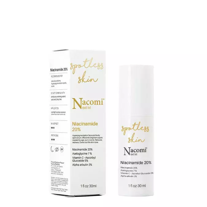Nacomi - Next Level - Niacinamide 20% - Punktinis Šviesinamasis Serumas su 20 % Niacinamido - taškinis šviesinantis serumas su 20 % niacinamido - preparatas, skirtas taškiniam odos spalvų pakitimų naudojimui. Dėl sudėtyje esančio niacinamido, vitamino C, azeloglicino ir alfa-arbutino jis palaiko kovą su įvairios kilmės dėmėmis, jas šviesina ir užkerta kelią jų susidarymui. Serumas praturtintas drėkinamąja trehaloze ir hialurono rūgštimi, kuri gerina pakitusios odos regeneraciją. Priemonė išlygina odos tonusą, pasižymi priešraukšliniu poveikiu ir dėl priešuždegiminių savybių pagreitina odos gijimą. Visa formulė sudaryta iš natūralios kilmės žaliavų.