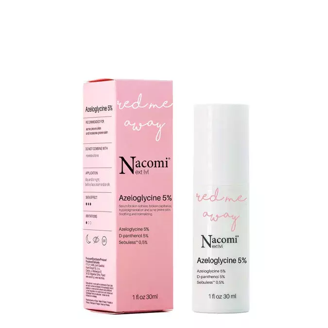 Nacomi - Next Level - Azeloglicinas 5% + B6 - raminamasis serumas kapiliarinei odai ir odai su rožine. Sudėtyje yra azeloglicino - azelaino rūgšties ir glicino derinio, kuris šviesina odos spalvos pakitimus, reguliuoja riebalinių liaukų veiklą, pasižymi antibakterinėmis savybėmis, mažina spuogų skaičių. SEBULESS™ kompleksas mažina riebalų išsiskyrimą ir suvienodina odos spalvą, mažina odos spalvos pakitimus ir paraudimą. Be to, pantenolis turi gydomąjį, raminamąjį ir drėkinamąjį poveikį, mažina epidermio vandens netekimą ir veiksmingai drėkina odą, todėl ji tampa minkšta ir elastinga, pasiflorų aliejus pasižymi raminamuoju poveikiu ir neleidžia epidermiui netekti vandens. Visa formulė sudaryta iš natūralios kilmės žaliavų.