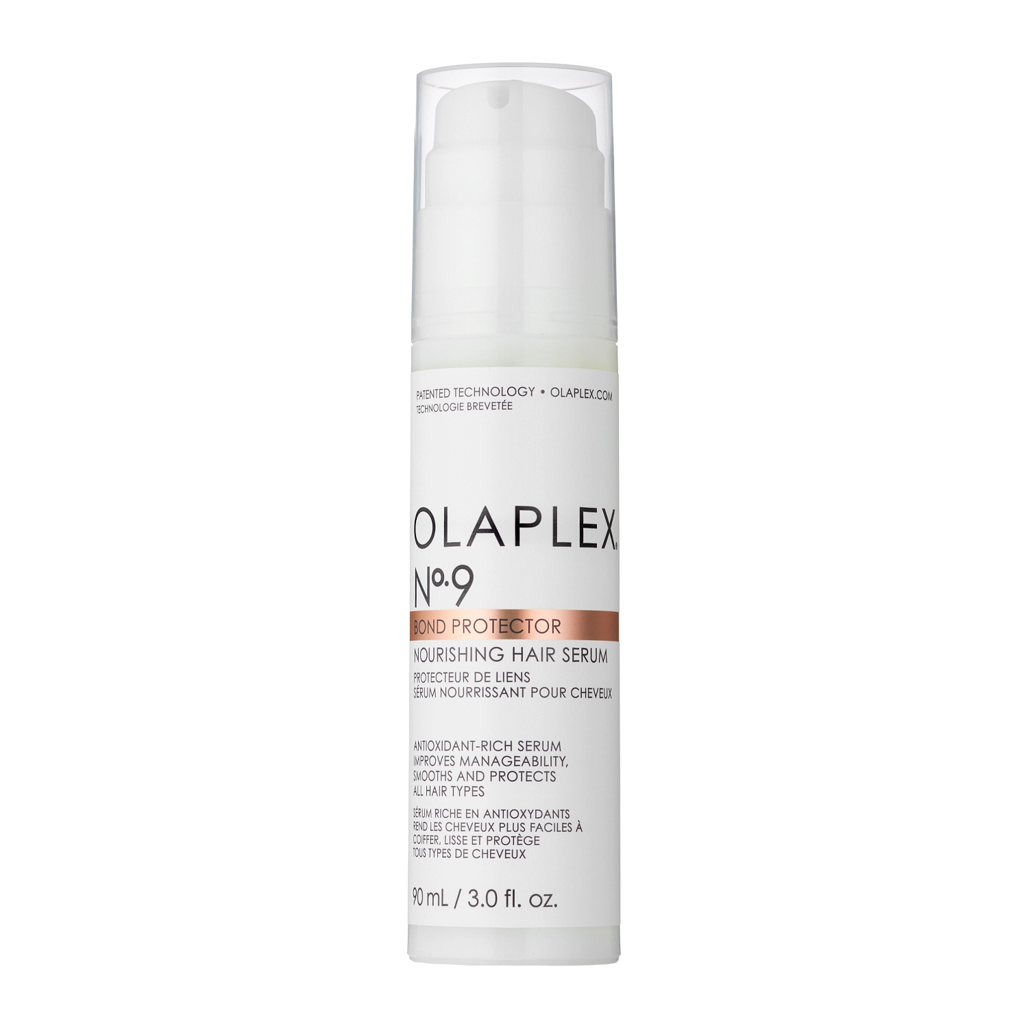 Olaplex- No. 9 Bond Protector Nourishing Serum - lengvos tekstūros ir turtingos sudėties plaukų serumas, kuriame gausu sruogas puoselėjančių ingredientų. Į formulę įeina firminis "Olaplex" ingredientas bisaminopropil diglikolio dimaleatas, kuris padeda išsaugoti disulfidinius tiltelius plauko struktūroje, nepaisant balinimo ir dažymo. Sudėtyje taip pat yra keletas drėkinamųjų medžiagų, tokių kaip natrio hialuronatas, ksilitilgliukozidas, anhidroksilitolis, maltitolis ir ksilitolis. Tai humektantai, kurie sulaiko vandenį plaukuose ir pasižymi glotninamuoju ir blizginamuoju poveikiu. Pridėtas pantenolis stiprina ir regeneruoja plaukus, o raudonųjų jūros dumblių ekstraktas apsaugo nuo žalingo laisvųjų radikalų poveikio. Serumas taip pat apsaugo plaukus nuo karščio.