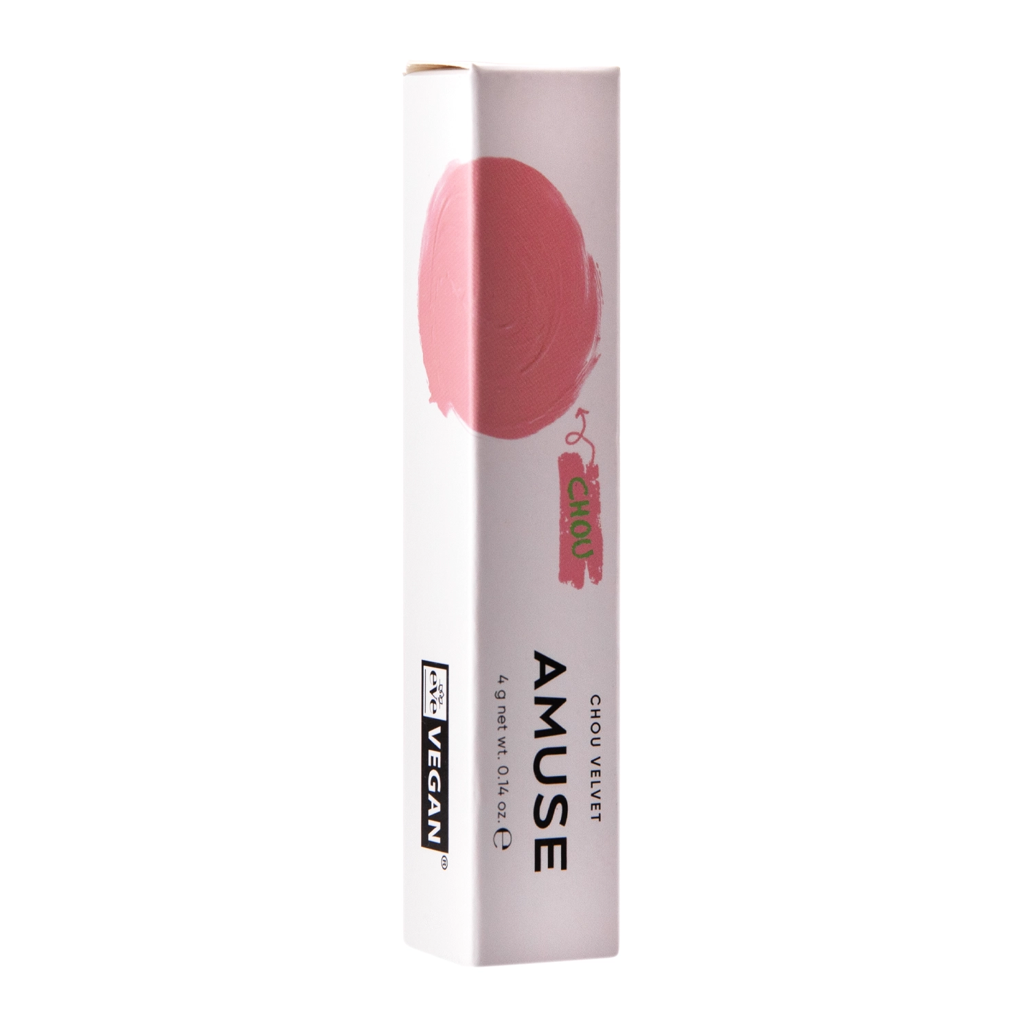 Amuse - Chou Velvet - 01 Boksoonga Chou - drėkinamasis lūpų tintas su satino efektu. Turi švelnų rožinį atspalvį, primenantį sultingą sorbetą. Kreminė tekstūra leidžia lengvai ir tiksliai padengti visas lūpas. Sudėtyje esanti hialurono rūgštis ir keramidai padeda išlaikyti tinkamą drėgmės lygį ir saugo lūpas nuo išsausėjimo. Turi ilgai išliekančią, atsparią išsitepimui formulę. Produktas yra veganiškas.