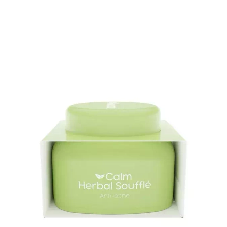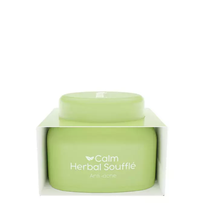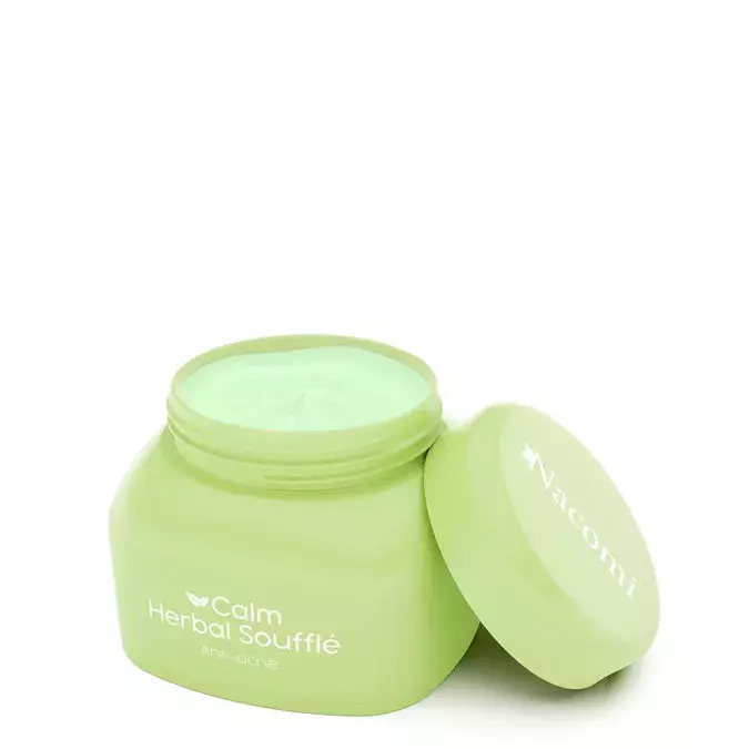 Nacomi - Calm Herbal Sufflé - raminamasis kreminis sufletas nuo aknės. Jo sudėtyje yra čiobrelių ekstrakto, pasižyminčio priešuždegiminiu ir antibakteriniu poveikiu, ir lapinio kopūsto ekstrakto, padedančio mažinti aknės pažeidimus. Pušų spurgų ekstraktas pasižymi antibakteriniu poveikiu, o tamanu aliejus - priešuždegiminiu poveikiu, taip pat jis palaiko odos regeneraciją ir mažina aknės pažeidimus. Be to, niacinamidas stiprina odos apsauginį barjerą, reguliuoja riebalų išsiskyrimą, pasižymi antioksidaciniu, priešuždegiminiu ir šviesinamuoju poveikiu, mažina riebalines liaukas. Visa formulė sudaryta iš natūralios kilmės žaliavų.