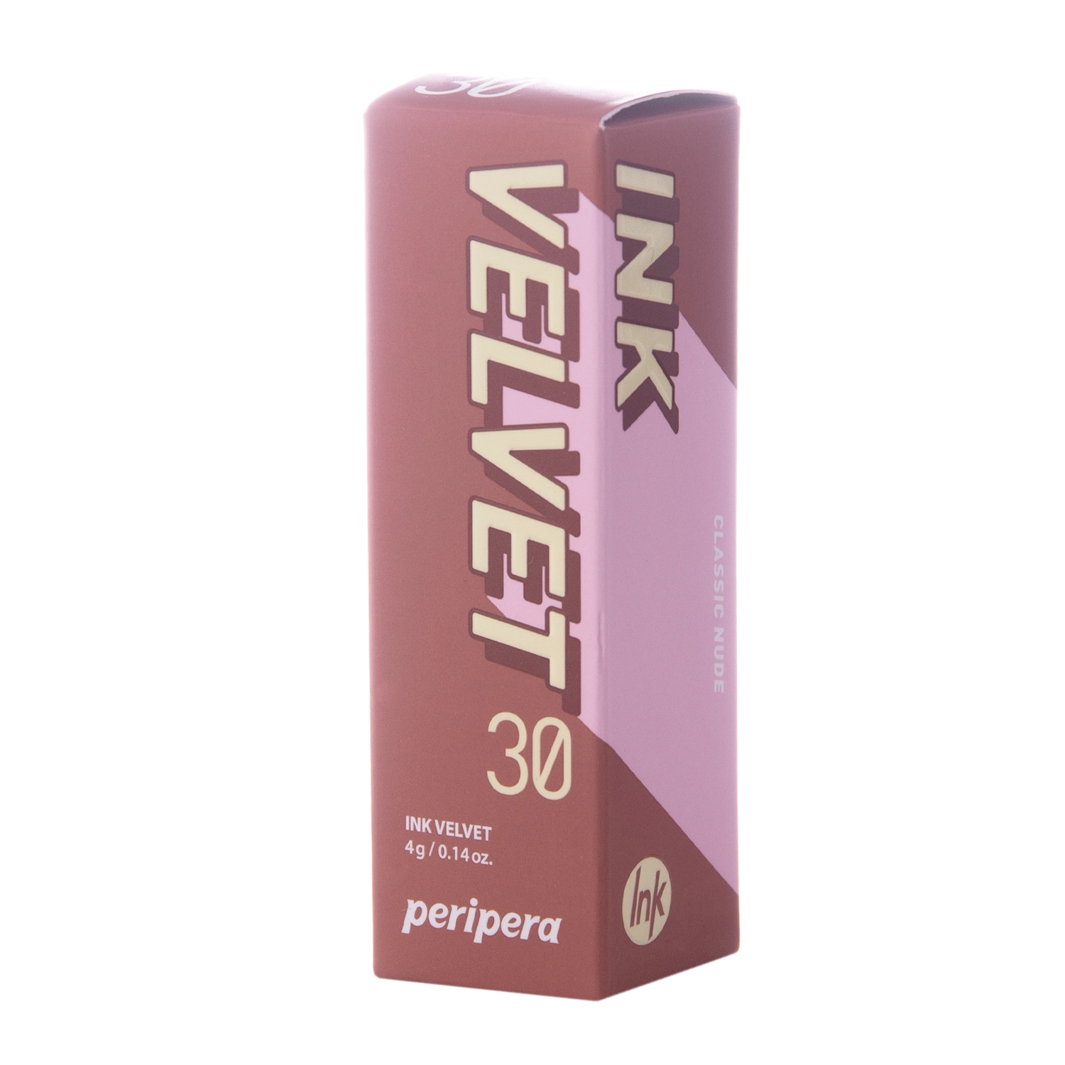 Peripera - Ink The Velvet - 30 Classic Nude - lūpų tintas nude atspalvio, kurs ant lūpų palieka ilgai išliekančią spalvą. Priemonė pasižymi lengvu satino atspalviu ir kreminės formulės konsistencija. Dėl stiprios pigmentacijos galima keisti lūpų makiažo intensyvumą. Juo galima užpildyti visas lūpas arba švelniai patepti produktu lūpų centrą, sukuriant subtiliai neryškų efektą.