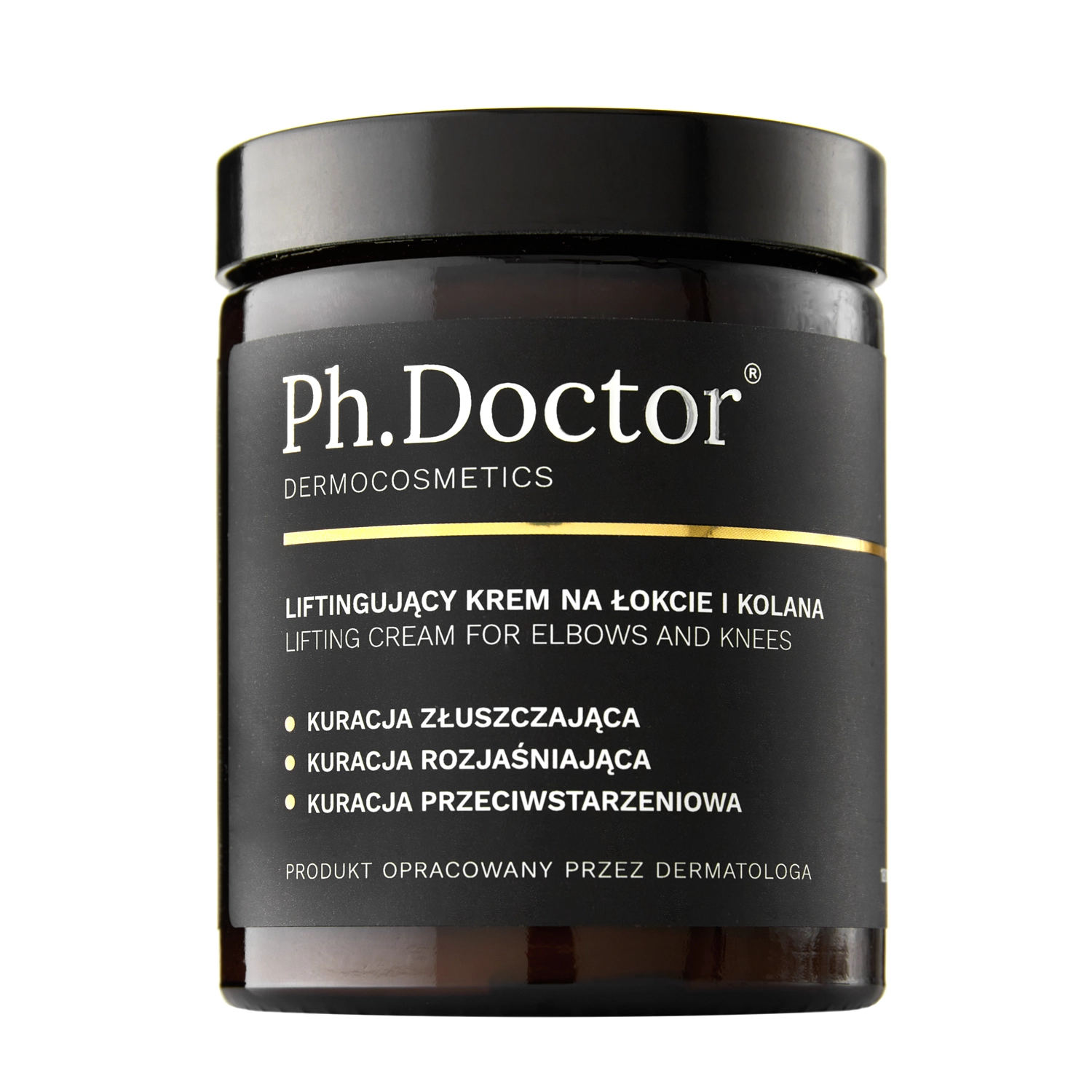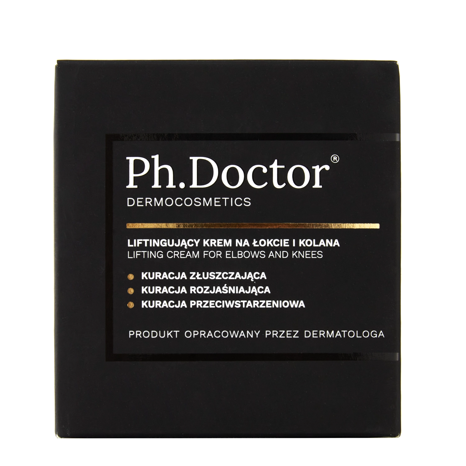 Ph.Doctor - Liftinguojantis Alkūnių ir Kelių Kremas - šveičiamasis kremas alkūnių ir kelių odai. Tinka moterims ir vyrams. Netinka nėščioms ir krūtimi maitinančioms moterims. Sudėtyje yra 12 % glikolio rūgšties, kuri turi šveičiamąjį poveikį, pašviesina odos spalvos pakitimus ir suvienodina odos spalvą, taip pat pagerina jos stangrumą ir drėkinimą. Sudėtyje esantis vitaminas C atkuria odos spindesį ir turi senėjimą stabdantį poveikį. Makadamijos aliejus kartu su taukmedžio sviestu pasižymi apsauginiu ir maitinamuoju poveikiu, o pantenolis ramina sudirgimus, regeneruoja ir minkština odą. Kremas normalizuoja epidermio keratinizaciją ir veikia prieš senėjimą. Jo pH yra žemas, todėl gali atsirasti šerpetojimo pojūtis. Dėl šios priežasties nerekomenduojamas žmonėms, kurių oda labai jautri. Veganiškos kosmetikos priemonės sudėtyje yra 79 % natūralios kilmės ingredientų.
