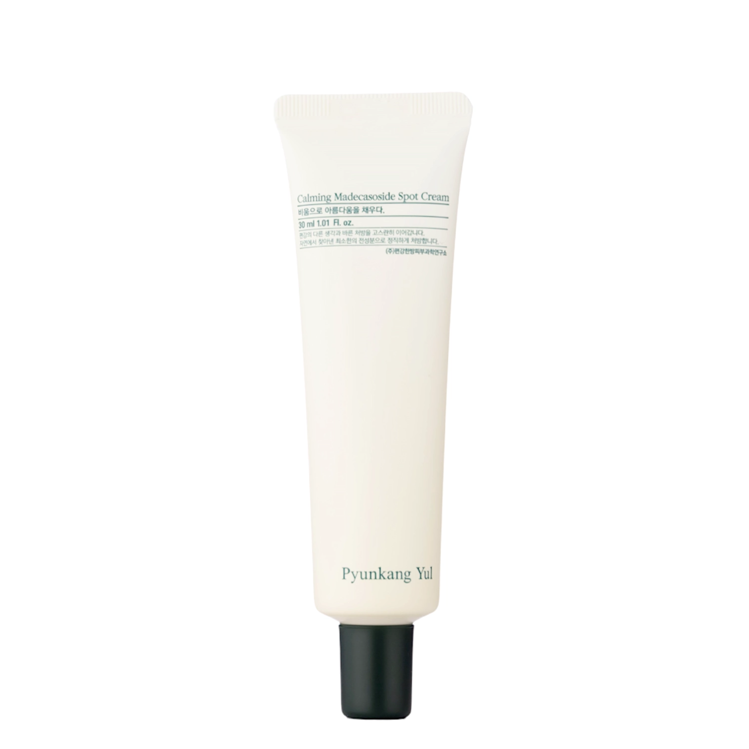Pyunkang Yul - Calming Madecassoside Spot Cream - raminamasis dėmių kremas probleminėms dėmėms ir netobulumams. Skatina gijimą ir regeneraciją. Sudėtyje yra raminančio Centella Asiatica ekstrakto ir arbatmedžio ekstrakto, pasižyminčio antibakteriniu ir sutraukiančiu poveikiu. Vijoklinio medžio ekstraktas pasižymi priešuždegiminiu poveikiu, lengvai šveičia ir mažina riebalų išsiskyrimą. Priemonė praturtinta drėkinamaisiais ingredientais - hialurono rūgštimi ir peptidais. Kremą galima tepti dėmėmis ant probleminių, paraudusių vietų ir odos trūkumų.