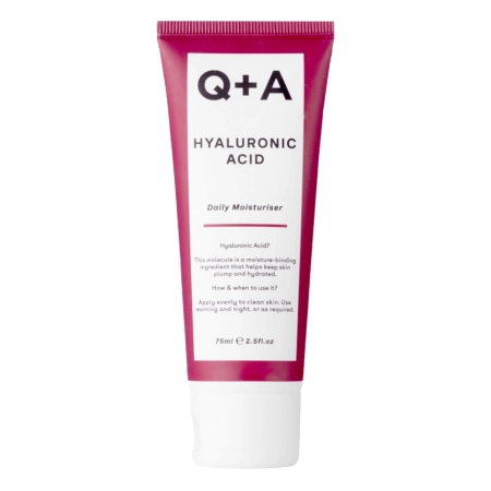 Q+A - Hyaluronic Acid Daily Moisturiser - labai drėkinantis kremas, suteikiantis reikiamą kiekį drėgmės visų tipų odai. Jo sudėtyje yra dviejų formų natrio hialuronato, kuris, surišdamas vandenį epidermyje, palaiko tinkamą drėkinimo lygį ir papildomai lygina odą. Savo ruožtu poliglutamo rūgštis pasižymi stipriu priešraukšliniu ir drėkinamuoju poveikiu. Alavijo lapų sultys ramina ir švelnina odą, o simondsijų aliejus regeneruoja, suteikia odai elastingumo ir stangrumo. Vynuogių sėklų aliejus pasižymi antibakterinėmis ir nuo spuogų apsaugančiomis savybėmis, todėl kremas tinka problemiškai odai.