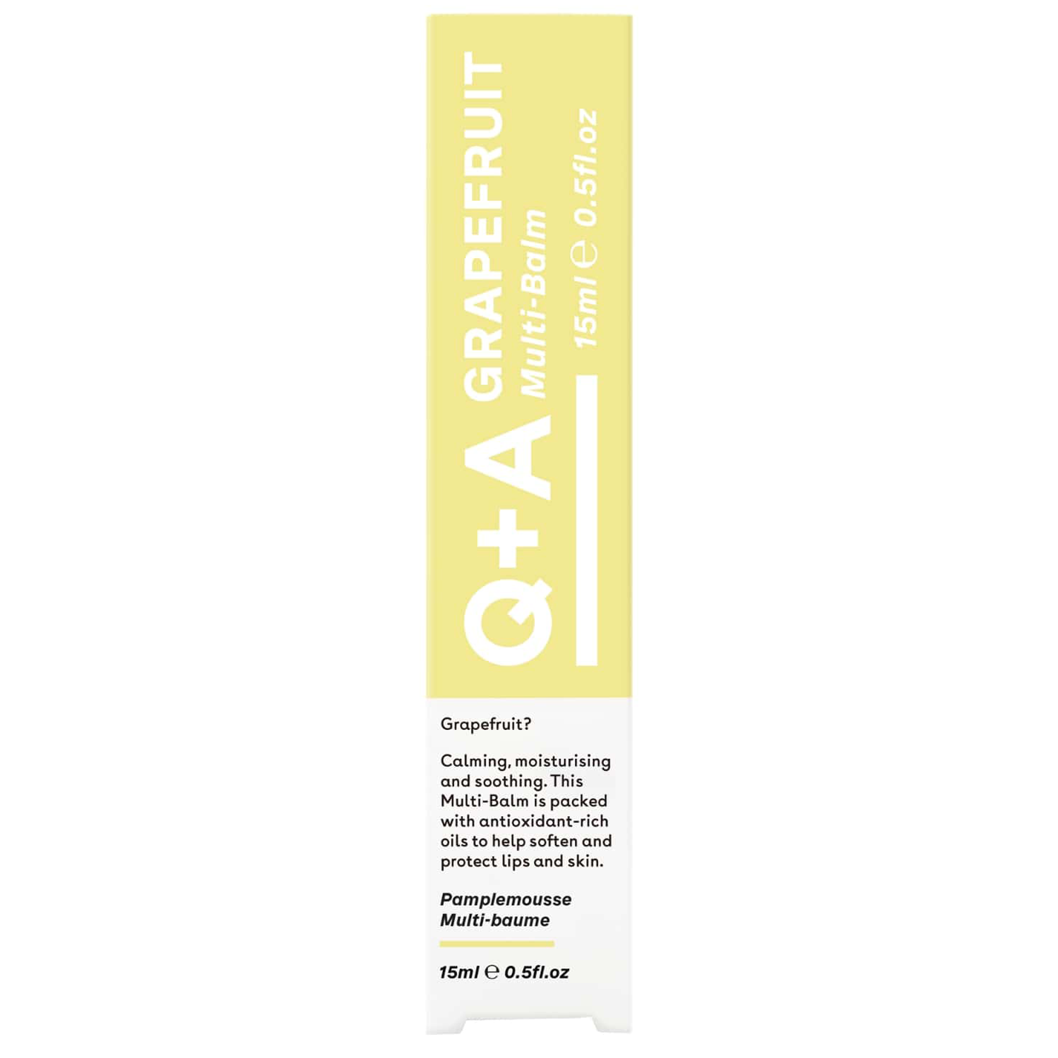 Q+A- Grapefruit Multi-Balm - daugiafunkcinis balzamas, skirtas sausoms vietoms, pavyzdžiui, suskeldėjusioms lūpoms, alkūnėms, keliams. Jo formulė yra maitinamoji ir skirta sausumui lyginti, riebumui didinti ir odai regeneruoti. Dėl to į jo sudėtį įtraukta daug minkštinamųjų medžiagų, tokių kaip ricinos aliejus, saldžiųjų migdolų aliejus, simondsijų aliejus ir kakavos sviestas. Skvalano sudėtyje esantis skvalanas drėkina. Produktas turi apsauginį poveikį ir atkuria komfortą. Priemonė yra veganiška ir sudaryta iš natūralios kilmės ingredientų.