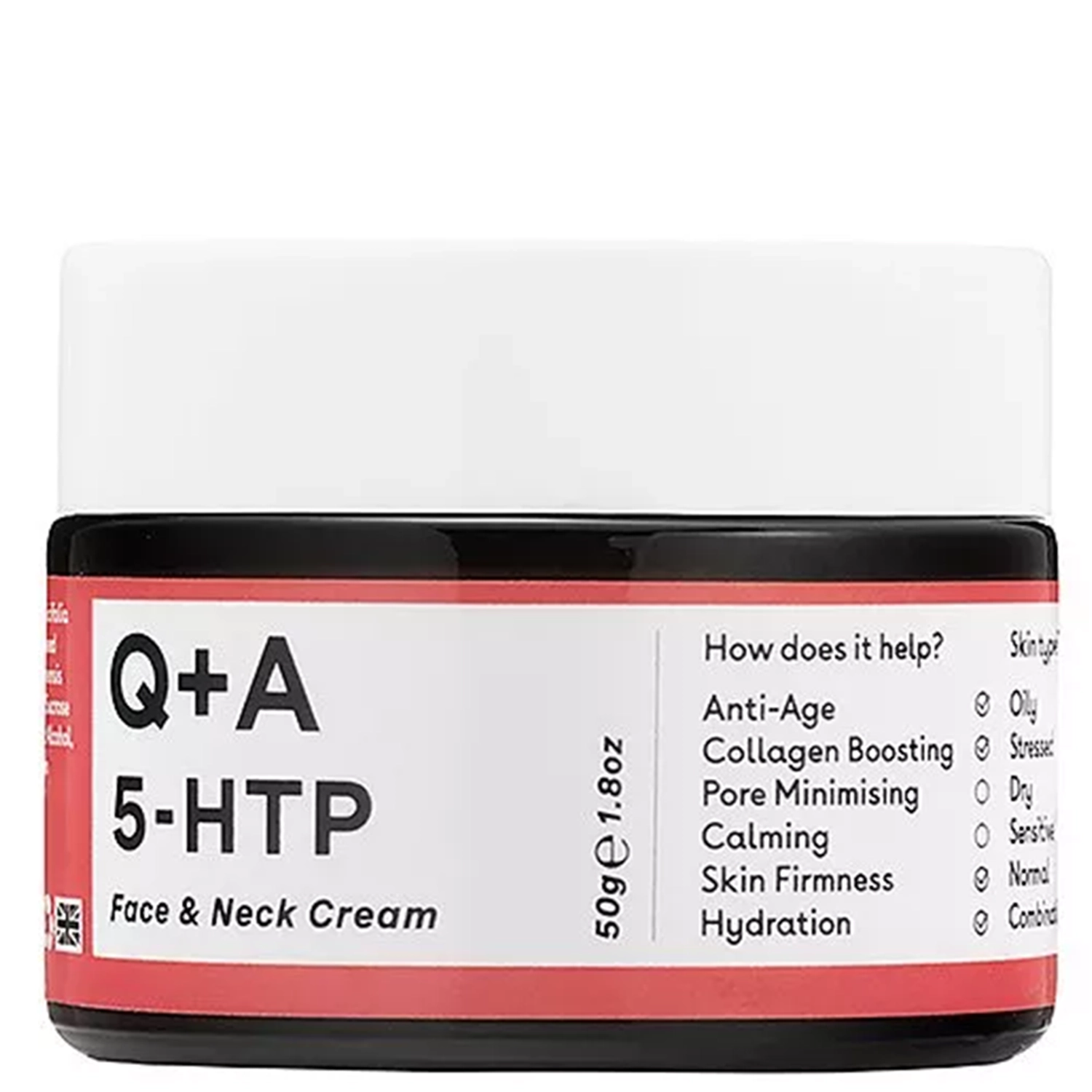 Q+A- 5-HTP - veido ir kaklo kremas - senėjimą stabdantis veido kremas visų tipų odai. Afrikinių juodųjų pupelių sėklų ekstraktas kartu su kofeinu gerina odos elastingumą ir stangrina odą. Kofeinas mažina paburkimą, todėl puikiai tiks jūsų rytinei odos priežiūros rutinai. Saulėgrąžų aliejus puikiai drėkina odą, o vitaminas E yra antioksidantas, kuris lėtina odos senėjimo procesus.