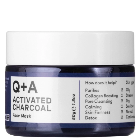 Q+A- Aktyvuota anglis - veido kaukė - valomoji aktyviosios anglies kaukė, kuri veiksmingai pašalina nešvarumų perteklių nuo odos paviršiaus. Ji padeda subalansuoti sebumo išsiskyrimo lygį ir atblokuoja riebalinių liaukų latakus. Pagrindinė sudedamoji dalis yra aktyvinta anglis, kuri labiausiai atsakinga už odos detoksikaciją. Bentonitas ir baltasis molis padeda detoksikacijai, o pridėtas aliejų mišinys: saldžiųjų migdolų, argano, saulėgrąžų ir taukmedžio sviestas skatina odos maitinimą ir regeneraciją.