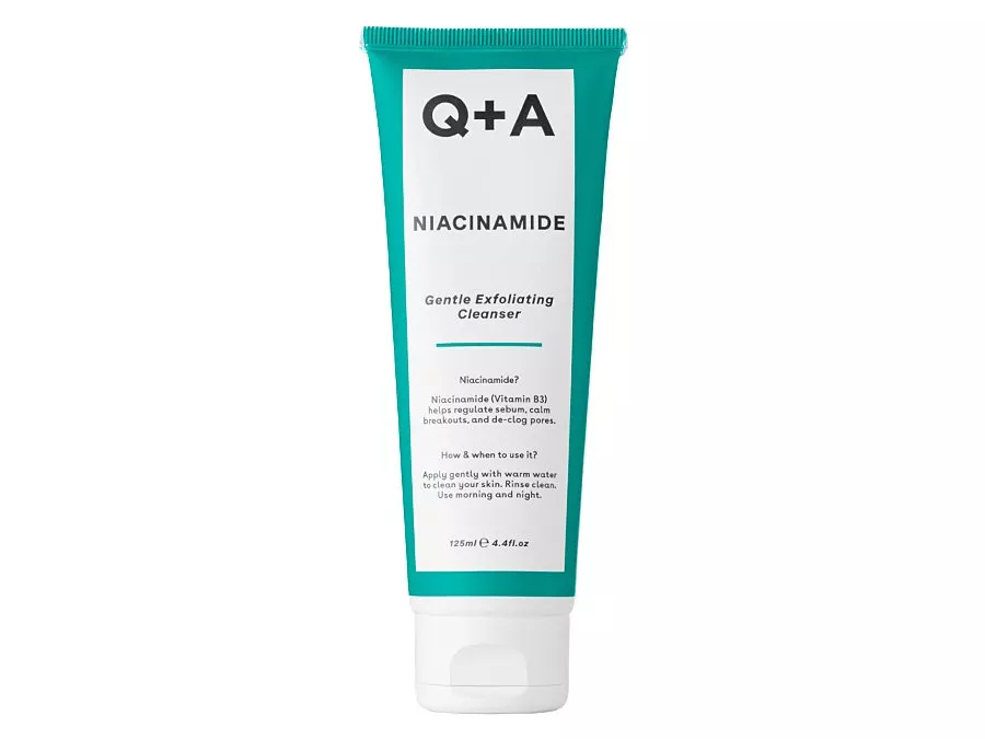 Q+A- Niacinamide - Gentle Exfoliating Cleanser - valomasis gelis, ypač skirtas mišriai, riebiai ir problematiškai odai. Sudėtyje esantys simondsijų esteriai padeda nušveisti epidermį ir išlyginti. Alavijų ekstraktas pagreitina gijimą, ramina ir nuramina. Sudėtyje yra niacinamido, kuris stiprina odos barjerą, be to, reguliuoja riebalų išsiskyrimą, veikia priešuždegimiškai ir šviesina. Jis sutraukia riebalines liaukas. Inulino ir fruktozės derinys stiprina odos mikrobiomą, mažina uždegimą ir neleidžia epidermiui netekti vandens. Priemonė valo odą, kartu apsaugodama nuo sudirgimo ir malšindama uždegimą.