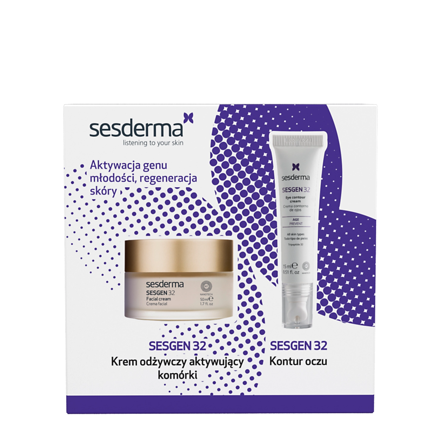 - SESGEN 32 Cell Activating Nourishing Cream - maitinamasis veido kremas. Sudėtyje esantys teprenonas, peptidas ir adenozinas pasižymi stipriomis nuo senėjimo savybėmis, veiksmingai lėtina odos senėjimo procesus ir skatina jos regeneraciją. Keramidų kompleksas stiprina ir atkuria hidrolipidinį barjerą, saugo odą nuo drėgmės netekimo ir neigiamo aplinkos poveikio. Probiotikas – Bifida bakterijų lizatas padeda suvienodinti odos spalvą ir atkuria mikrobiomos pusiausvyrą, suteikdamas odai sveiką išvaizdą. Talpa: 50 ml.