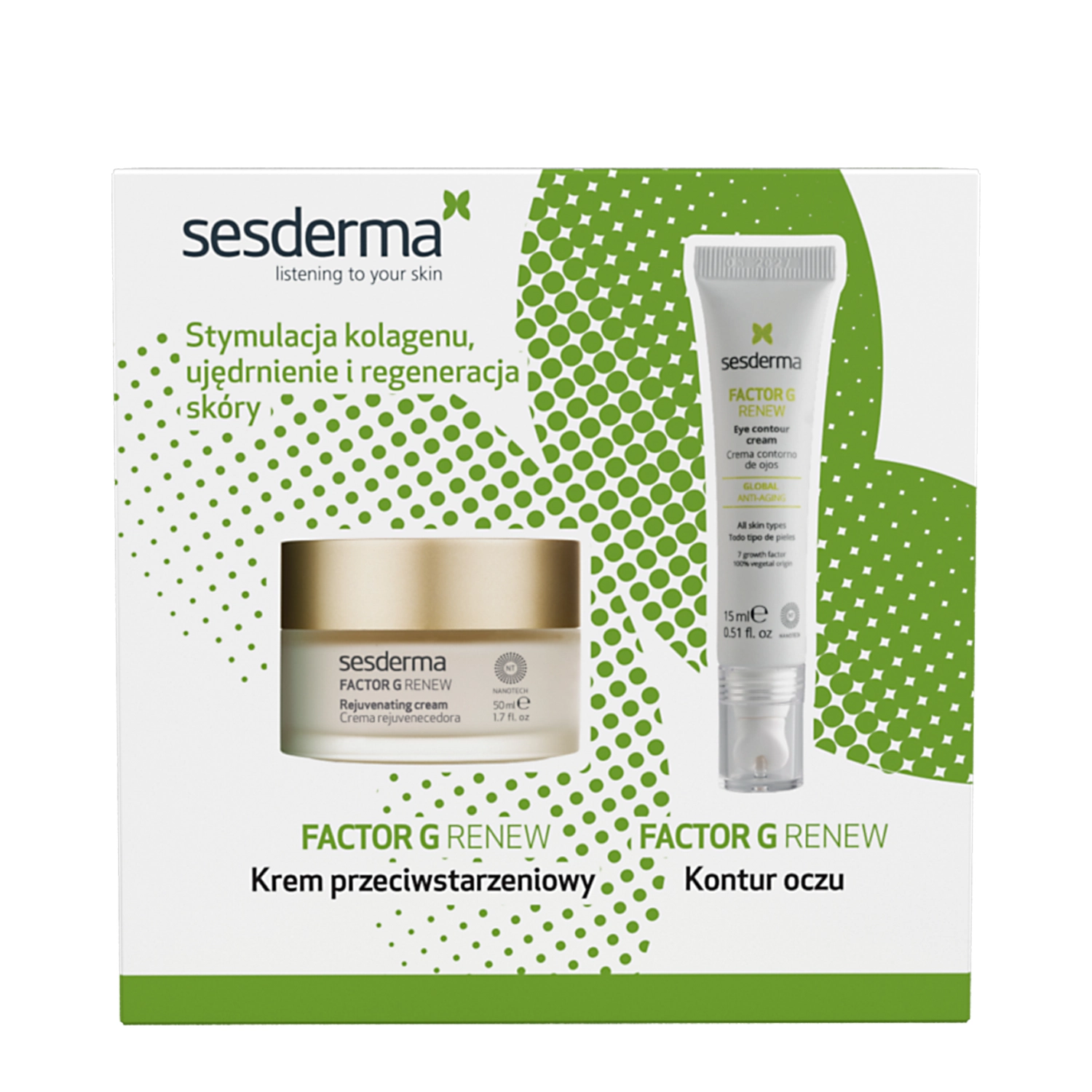 - FACTOR G RENEW Rejuvenating Cream - kremas nuo senėjimo, kuris stangrina suglebusią veido odą, lygina smulkias raukšles ir linijas, taip pat maitina ir regeneruoja epidermį. Produkto sudėtyje yra augimo faktorių, peptidų, azijinės centelės ekstrakto ir resveratrolio. Talpa: 50 ml.