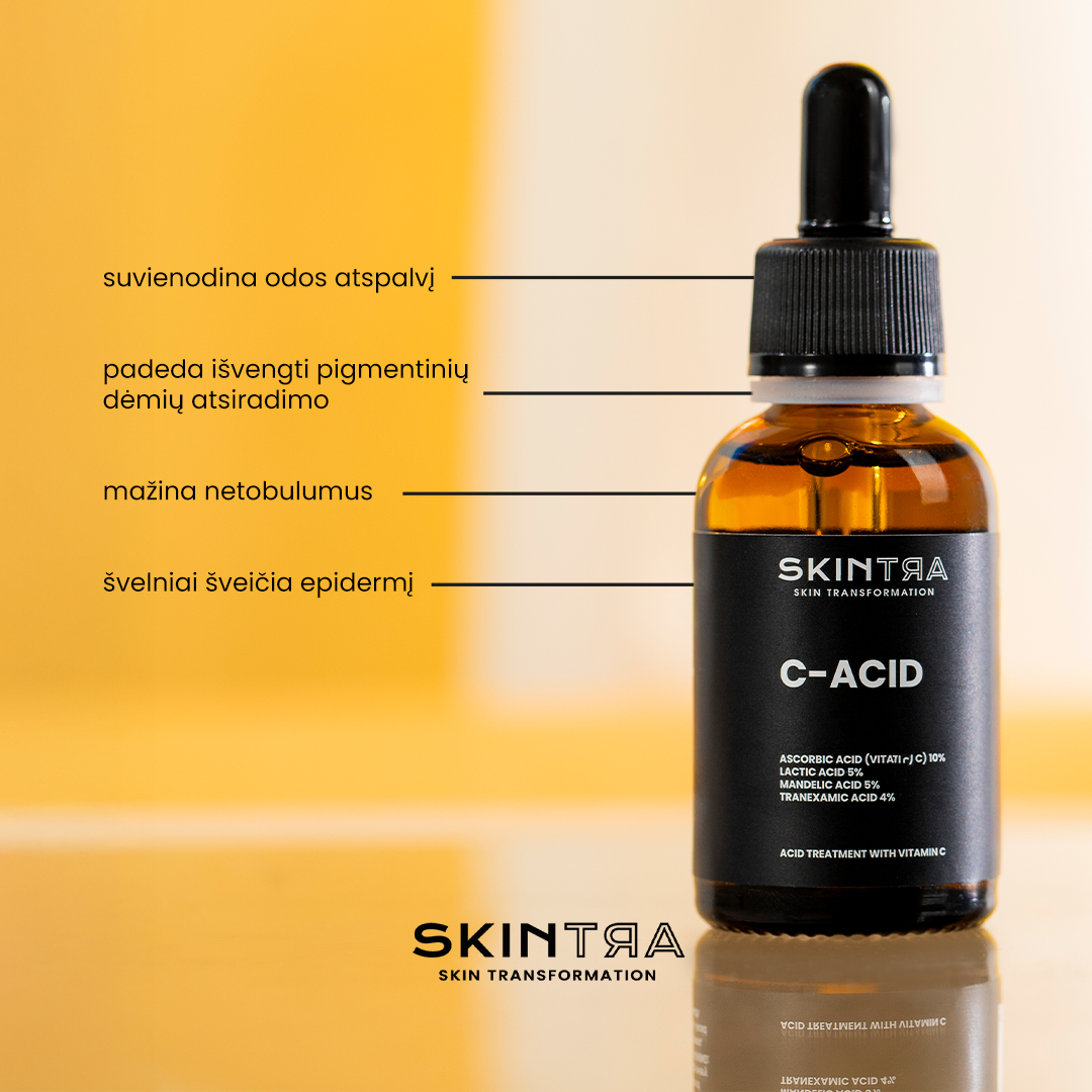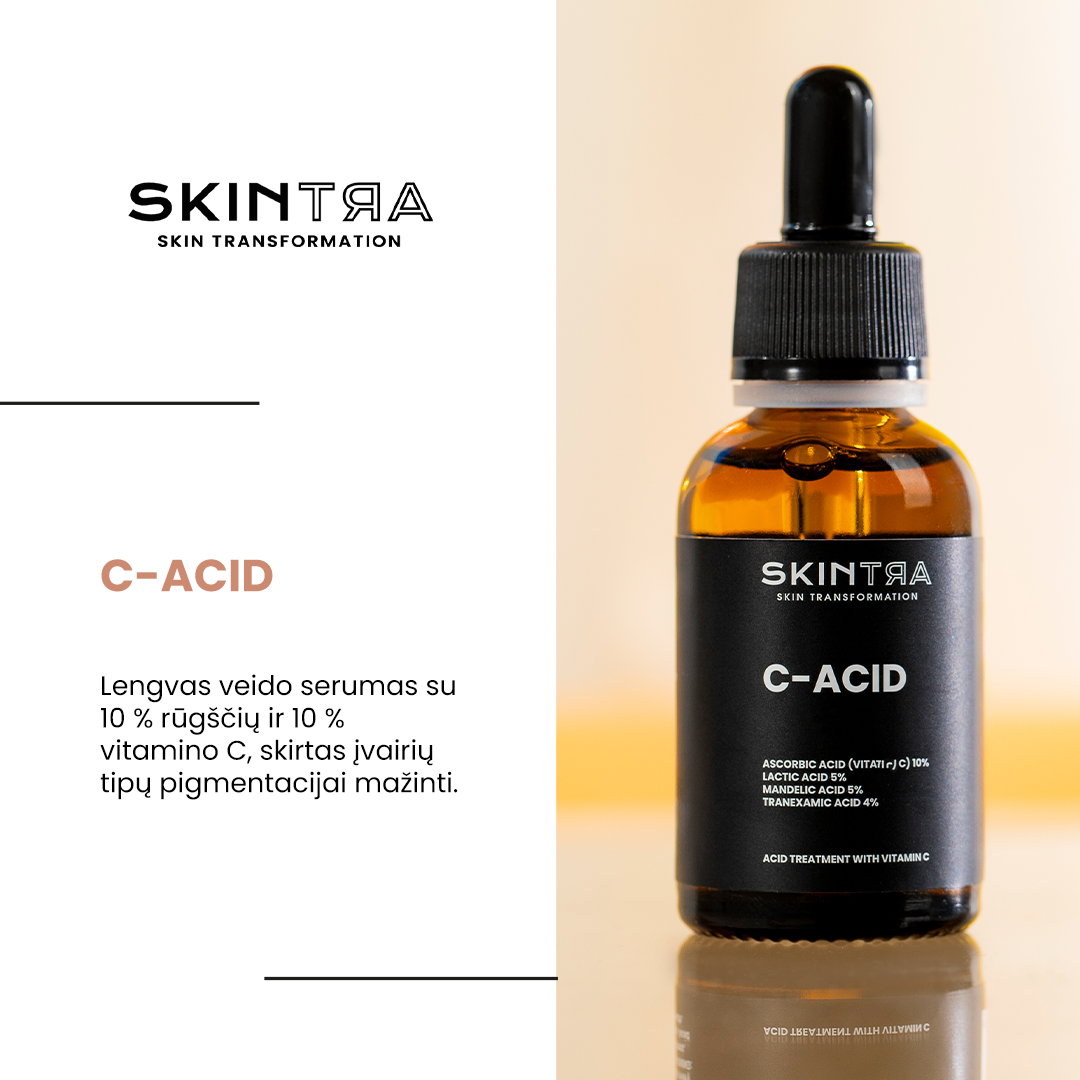SkinTra - C-Acid - visapusiška veido, kaklo ir dekoltė odos priežiūra skysto, vandens pavidalo serumu. Priemonė palieka šiek tiek lipnų paviršių. Formulėje yra unikalus 10 % koncentracijos AHA rūgščių, 10 % koncentracijos askorbo rūgšties, 10 % koncentracijos traneksamo ir ferulo rūgšties derinys. Toks pažangus veikliųjų medžiagų derinys padaro šį produktą švelnesniu SkinTra bestselerių, Light Your Skin ir rūgštinio šveitiklio Destructor, atitikmeniu. Didelės koncentracijos vitaminas C yra pagrindinė terapijos dalis ir kartu su ferulo rūgštimi veikia kaip stiprus antioksidantas. Jie neutralizuoja žalingą laisvųjų radikalų poveikį, o tai skatina senėjimo požymių mažėjimą. Be to, traneksamo rūgštis, žinoma dėl savo priešuždegiminių savybių, kartu su ferulo rūgštimi sustiprina vitamino C veiksmingumą. Reguliariai naudojant, oda įgauna tolygesnę spalvą ir tampa švytinti. Be to, priemonė veiksmingai mažina netobulumus, o inkštirų kiekis pastebimai sumažėja, taip prisidedant prie bendros odos būklės pagerėjimo. Tai unikalus odos priežiūros sprendimas, kuris yra paprasta ir veiksminga priemonė prieš pigmentines dėmes.