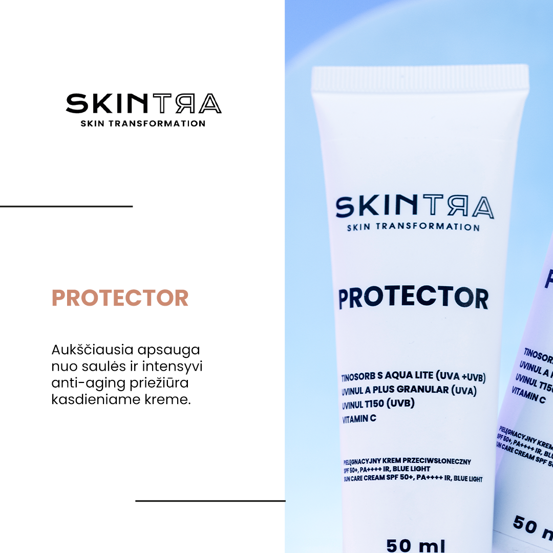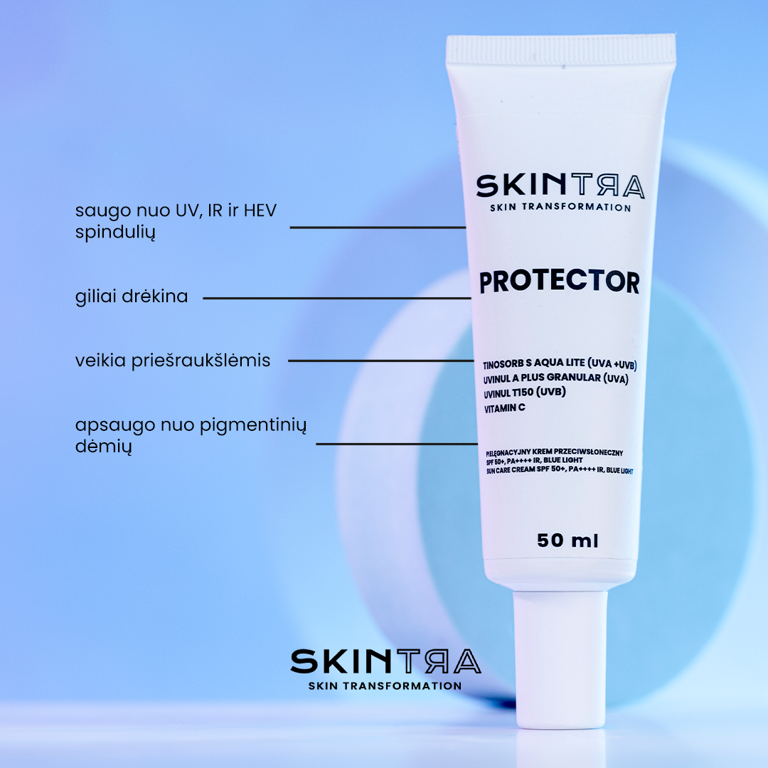 SkinTra - Protector - tai visapusiškai veikiantis kremas, derinantis apsaugą nuo saulės per visus metus ir aktyvią senėjimo prevenciją. Priemonės emulsinė formulė tinka visų tipų odai, todėl ją galima naudoti tiek veidui, tiek visam kūnui. Kaip patvirtino oftalmologas, preparatas yra saugus naudojant akių srityje. Kremas yra malonios formulės, suteikiantis odai satininio švelnumo efektą, bei sveiką ir skaisčią išvaizdą. Kremas nebalina odos, sukuria vientisą paviršinį odos sluoksnį ir negraužia akių. Sudėtyje panaudoti plačiajuosčiai filtrai užtikrina labai aukštą apsaugą nuo plataus spinduliuotės diapazono, nepriklausomai nuo metų laiko. Naudojami ingredientai aktyviai saugo nuo neigiamo mėlynosios šviesos ir infraraudonųjų spindulių poveikio. Šios medžiagos užtikrina apsaugą nuo laisvųjų radikalų, tad apsaugo nuo priešlaikinio senėjimo ir tarpląstelinio cemento pažeidimų, dėl kurių oda gali išsausėti ir sudirgti. Taip pat svarbu, kad produktas apsaugo nuo hiperpigmentacijos ir eritemos ne tik dėl naudojamų cheminių filtrų, bet ir dėl sudėtyje esančio vitamino C. Kiti ingredientai užtikrina, kad odos drėgmės lygis būtų nuolat palaikomas aukštame lygyje.