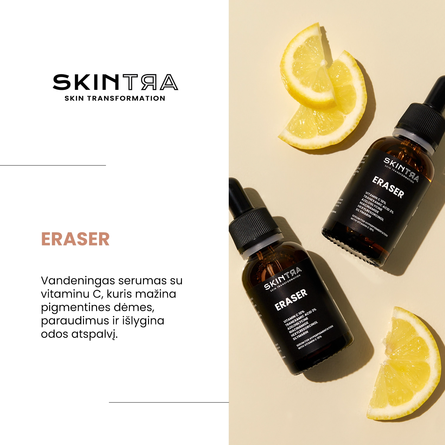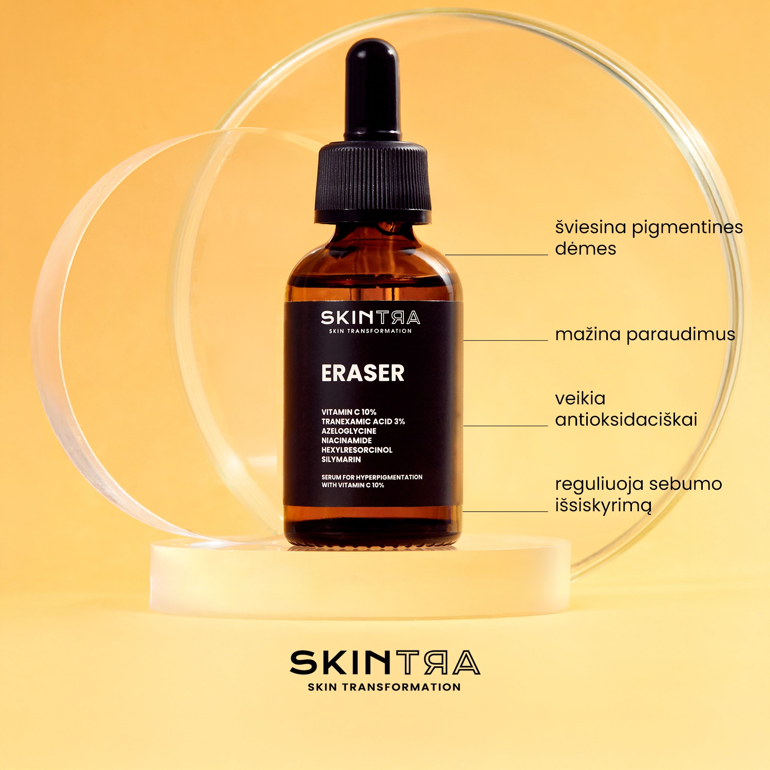 SkinTra - Eraser – kompleksinis serumas, skirtas odos, kenčiančios nuo įvairaus pobūdžio odos spalvos pokyčių – raudonos (po aknės, uždegimų) ir rudos (dėl melanino pertekliaus) priežiūrai. Jis yra vandeningos konsistencijos, dėl kurios ant odos išlieka šiek tiek pastebimas sluoksnis. Serumo pH yra lygus maždaug 5. Sudėtyje yra veiksmingų veikliųjų medžiagų, kurios veikia skirtingus pigmentinių dėmių susidarymo mechanizmus. Serumo sudėtyje yra 10 % etilintas vitaminas C, kuris pasižymi antioksidaciniu poveikiu ir šviesina odą, nes veikia melanino sintezę slopindamas tirozinazės aktyvumą. Kartu su vitaminu C veikia 3 % traneksamo rūgštis, kuri dėl savo priešuždegiminių savybių padeda mažinti paraudimus bei rudos spalvos pokyčius. Niacinamidas taip pat skatina odos šviesėjimą, rūpindamasis odos drėkinimu ir regeneracija. Be to, jis sustiprina heksilrezorcinolio poveikį, kuris mažina raudonų ir rudų spalvos pokyčių matomumą. Formulėje taip pat yra azeloglicino, kuris reguliuoja odos šveitimo procesą, ir silimarino, pasižyminčio stipriomis antioksidacinėmis savybėmis. Produktą rekomenduojama naudoti kasdien ir reguliariai, kartu su apsauga nuo saulės tam, kad rezultatai būtų matomi jau po kelių savaičių. Priemonės formulė yra veganiška ir netinka naudoti nėščioms moterims.