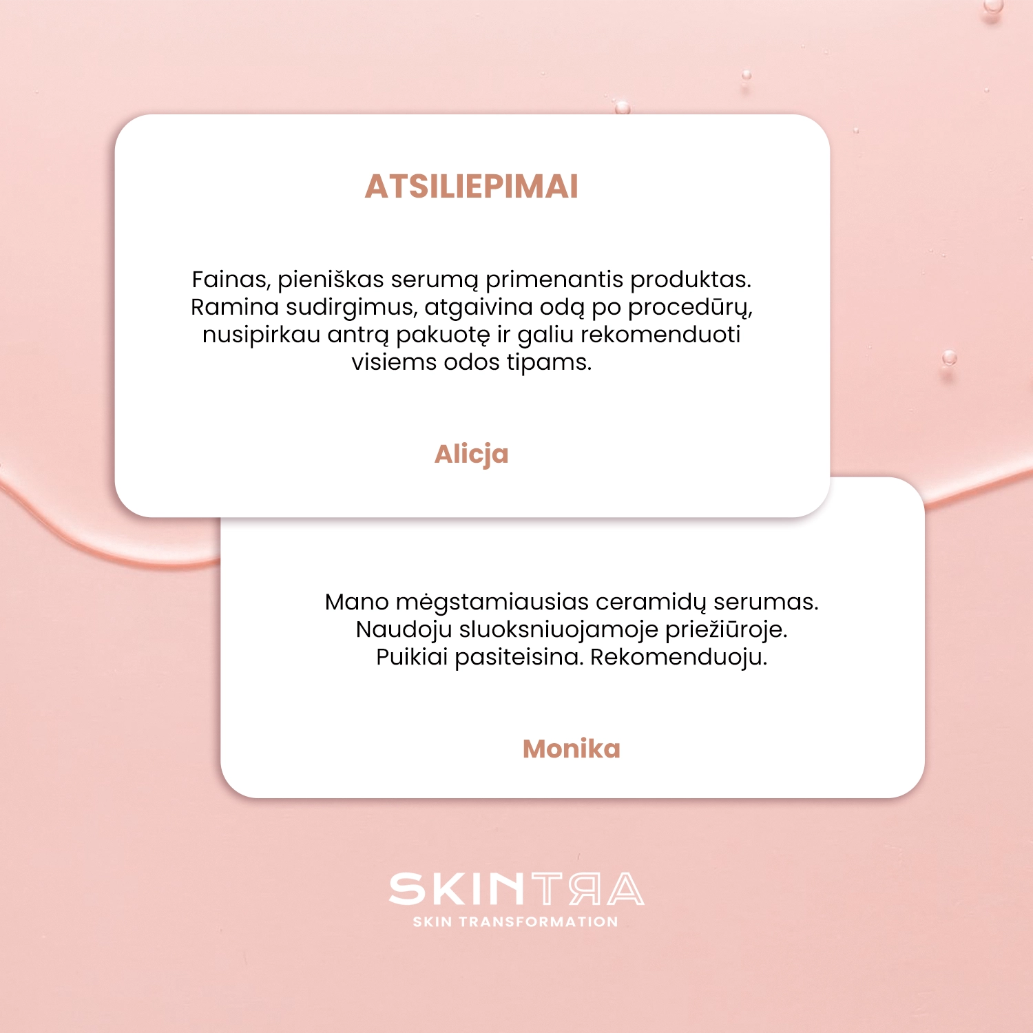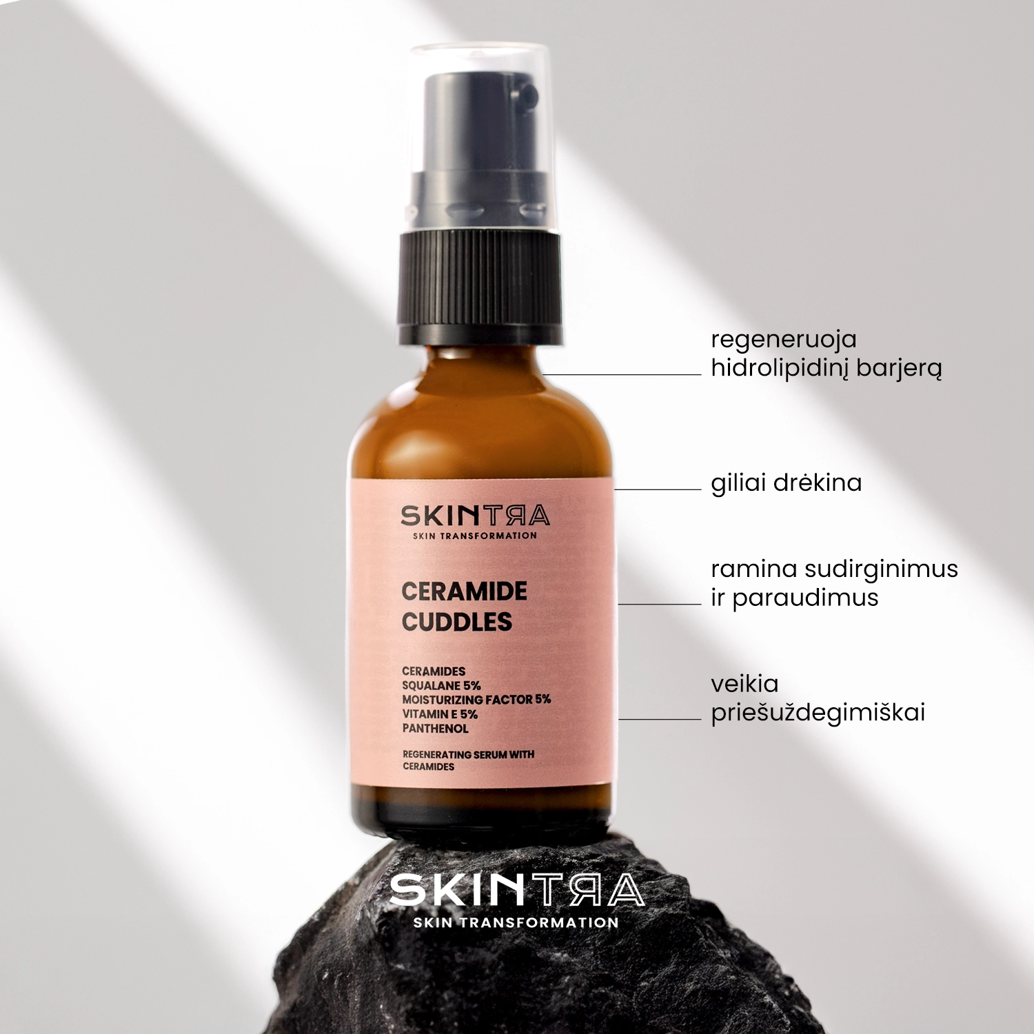 SkinTra - Ceramide Cuddles – regeneruojamasis serumas su keramidais, kuris padeda atkurti pažeistą hidrolipidinį barjerą. Šios lengvos, emulsinės formulės priemonė palieka satininį, apgaubiantį efektą ir gerai susigeria nepalikdama riebaus sluoksnio. Priemonė yra bekvapė ir hipoalerginė, todėl tinka visų tipų odai, įskaitant jautrią ir į alergijas linkusią odą. taip pat gali būti naudojamas jautriai akių sričiai. Jis užtikrina raminamąjį, raudonį mažinantį, drėkinamąjį ir intensyviai regeneruojantį poveikį. Išskirtines savybes suteikia 2 keramidų kompleksai, kurių bendra koncentracija yra 5,3 % ir kurių dėka atkuriamas tarpląstelinio cemento trūkumas bei atstatomas lipidų sluoksnis. Panaudotas 5 % NMF kompleksas didina odos drėgmės lygį, 5 % skvalano apsaugo epidermį nuo perteklinio vandens netekimo, o 5 % vitamino E pasižymi antioksidaciniu ir regeneraciniu poveikiu. Pantenolio ir alantoino dėka skatinamas gijimas, oda tampa švelnesnė, o odos sudirgimas malšinamas. Priemonę galima naudoti tiek dienai, tiek nakčiai. Tinkamai papildys priežiūrą tuomet, kai yra naudojamos stipresnės veikliosios medžiagos, ir nuramins dėl dirginančių procedūrų ar priemonių sudirgusią odą.