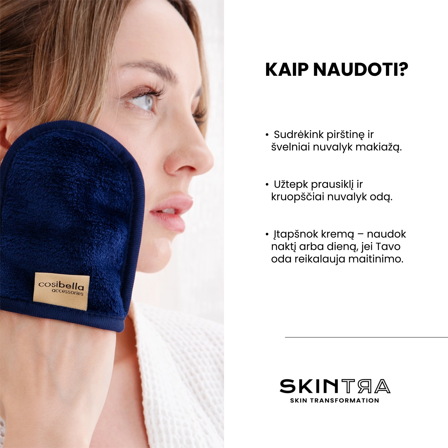 - Cosibella Accessories - Demakiažo Pirštinė Tik Su Vandeniu - Pacific Blue - prieš demakiažą sudrėkinkite pirštinę šiltu vandeniu, kad suaktyvintumėte jos valomąsias savybes. Tada švelniai nuvalykite veidą, pašalindami makiažą ir nešvarumus. Po naudojimo kruopščiai išplaukite pirštinę pilku muilu ir išskalaukite arba išskalbkite skalbimo mašinoje, tuomet palikite visiškai išdžiūti švarioje, sausoje vietoje.