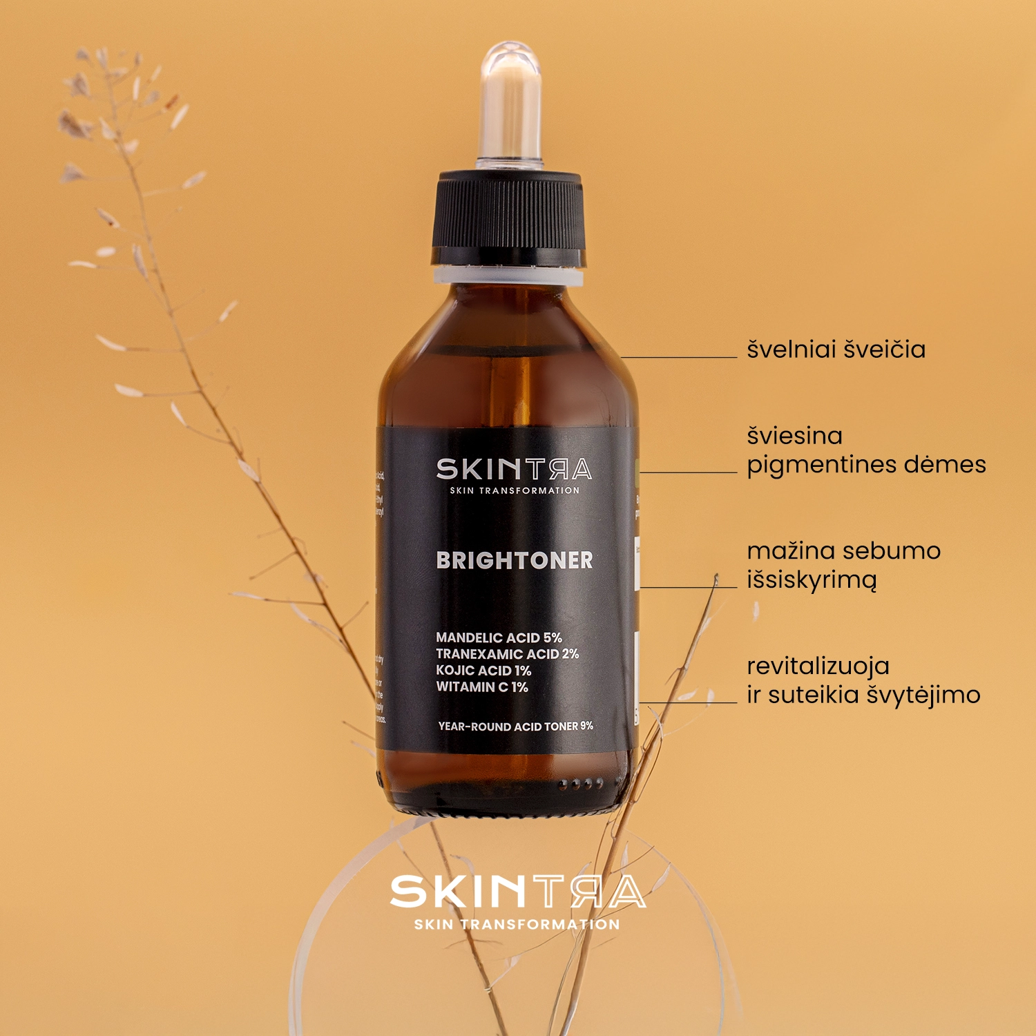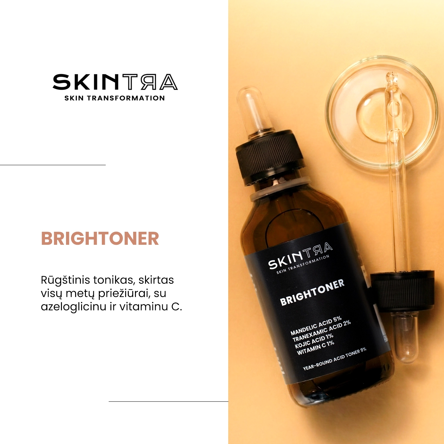 SkinTra - Brightoner - rūgštinis tonikas, skirtas ištisus metus prižiūrėti odą namuose. Jį, be kita ko, sudaro: migdolų rūgštis, kojinė rūgštis, traneksamo rūgštis, azeloglicinas ir vitaminas C, atsakingi už odos šveitimą, tekstūros gerinimą ir šviesinimą, o dėl tirozinazę slopinančių savybių daro įtaką melanino sintezės mažėjimui, todėl sumažėja naujų spalvos pokyčių rizika. Tonikas susilpnina epidermio ląstelių jungtis, pagreitindamas fiziologinį šveitimo procesą, kartu palaipsniui šviesindamas spalvos pokyčius. Tinka išblyškusiai, papilkėjusiai, užterštai odai su spalvos pokyčiais, taip pat odai, linkusiai į spuogus ir inkštirus. Priemonė neturi fototoksinio ar fotosensibilizuojančio poveikio, ją galima naudoti nepriklausomai nuo metų laiko, o jos pH yra maždaug 3,8. Kosmetikos priemonė yra veganiška.