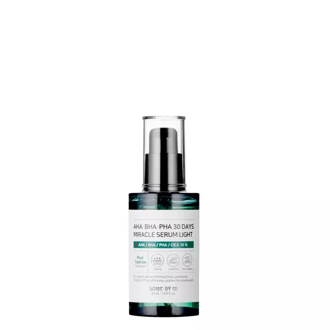 Some by Mi - AHA BHA PHA 30 Days - Miracle Serum Light – lengvesnė originalaus serumo versija, pasižyminti gaivinančia, mažiau riebia konsistencija. Tai 30 dienų trukmės priemonė su AHA, BHA ir PHA rūgštimis, kurios pašalina negyvas odos ląsteles, normalizuoja sebumo išsiskyrimą ir mažina pigmentines dėmes. Formulė sukurta arbatos medžio vandens pagrindu, kuris ramina sudirgimus bei paraudimus. Sudėtyje taip pat yra raminantis ir gijimą skatinantis azijinės centelės ekstraktas bei niacinamidas, kuris skaistina dėmes ir stiprina odos barjerą. Produktas papildytas adenozinu, turinčiu stangrinamųjų savybių.