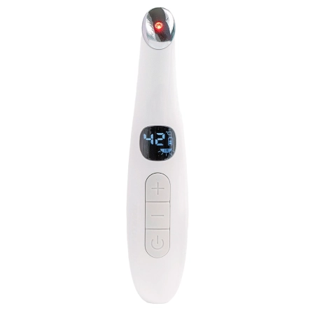 Naudojimo būdas: Užtepkite žirnio dydžio kiekį kremo arba serumo paakiams ir švelniai įmasažuokite jį švariu pirštu į odą aplink akis. Būkite atsargūs, kad kosmetika nepatektų į akis. Prietaiso nereikėtų naudoti be iš anksto užteptos kosmetikos priemonės. Tada palaikykite maitinimo mygtuką, kad įjungtumėte masažuoklį. Procedūros metu venkite žiūrėti tiesiai į LED diodus. Temperatūrą galite reguliuoti pagal savo poreikius naudodami „+“ ir „–“ mygtukus. Trumpai paspaudus maitinimo mygtuką galima keisti veikimo režimus tarp 1, 2 ir 3 režimų. Norėdami atlikti apatinio voko masažą, padėkite masažuoklio galiuką vidiniame akies kampe, tiesiai po apatinėmis blakstienomis, ir švelniai perkelkite jį link išorinio akies kampo. Šis judesys turėtų trukti apie 15 sekundžių, kad oda palaipsniui sušiltų. Procedūrą galima kartoti vieną ar du kartus, nepamirškite nemasažuoti to paties ploto ilgiau nei 60 sekundžių. Viršutiniam vokui rekomenduojama naudoti tik 3 režimą, kuriame raudona LED lemputė išjungta. Po masažo pakartokite visą procesą kitai akiai. Galiausiai palaikykite maitinimo mygtuką, kad išjungtumėte prietaisą, o metalinę masažo galvutę nuvalykite sausa, švaria šluoste.