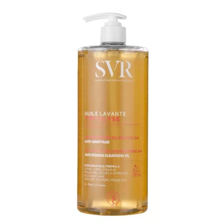 SVR - Topialyse Huile Lavante - švelnus kūno prausimosi aliejus, tinkamas visai šeimai, nuo pirmos gyvenimo dienos. Tinka labai sausai ir jautriai odai, linkusiai į alergiją ir atopiją. Jis valo ir apsaugo odą, o dėl sudėtyje esančio niacinamido stiprina apsauginį odos barjerą ir pasižymi priešuždegiminiu bei raminamuoju poveikiu. Pridėtas prebiotikas atkuria mikrobiomo pusiausvyrą, ramina ir palengvina sudirgimus ir ramina odos ligas. Be to, sacharido izomeratas pasižymi stipriu drėkinamuoju poveikiu. Šilkinė formulė apgaubia odą ir atkuria komfortą bei ramybę. Ji palieka odą švelnią ir kvepiančią.