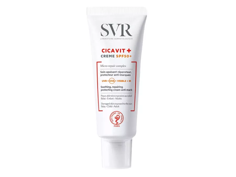 SVR - Cicavit+ Creme SPF50+ - hipoalerginis kremas, kurio formulė pagreitina odos regeneraciją ir kartu apsaugo ją nuo žalingo saulės poveikio. Jis drėkina ir neutralizuoja odos tempimą gijimo proceso metu. Dėl UVA ir UVB filtrų jis užtikrina labai aukštą apsaugą nuo UVB, UVB, VIS ir IR spindulių. Skirta žmonėms, kurių jautri, pažeista oda yra veikiama saulės: įbrėžimai, įtrūkimai, šerpetojimas, sudirgimai, švieži randai, po dermatologinių (lazerių, pilingų) ar chirurginių procedūrų, po tatuiravimo. Tinka vaikams nuo pirmos gyvenimo dienos ir suaugusiesiems.