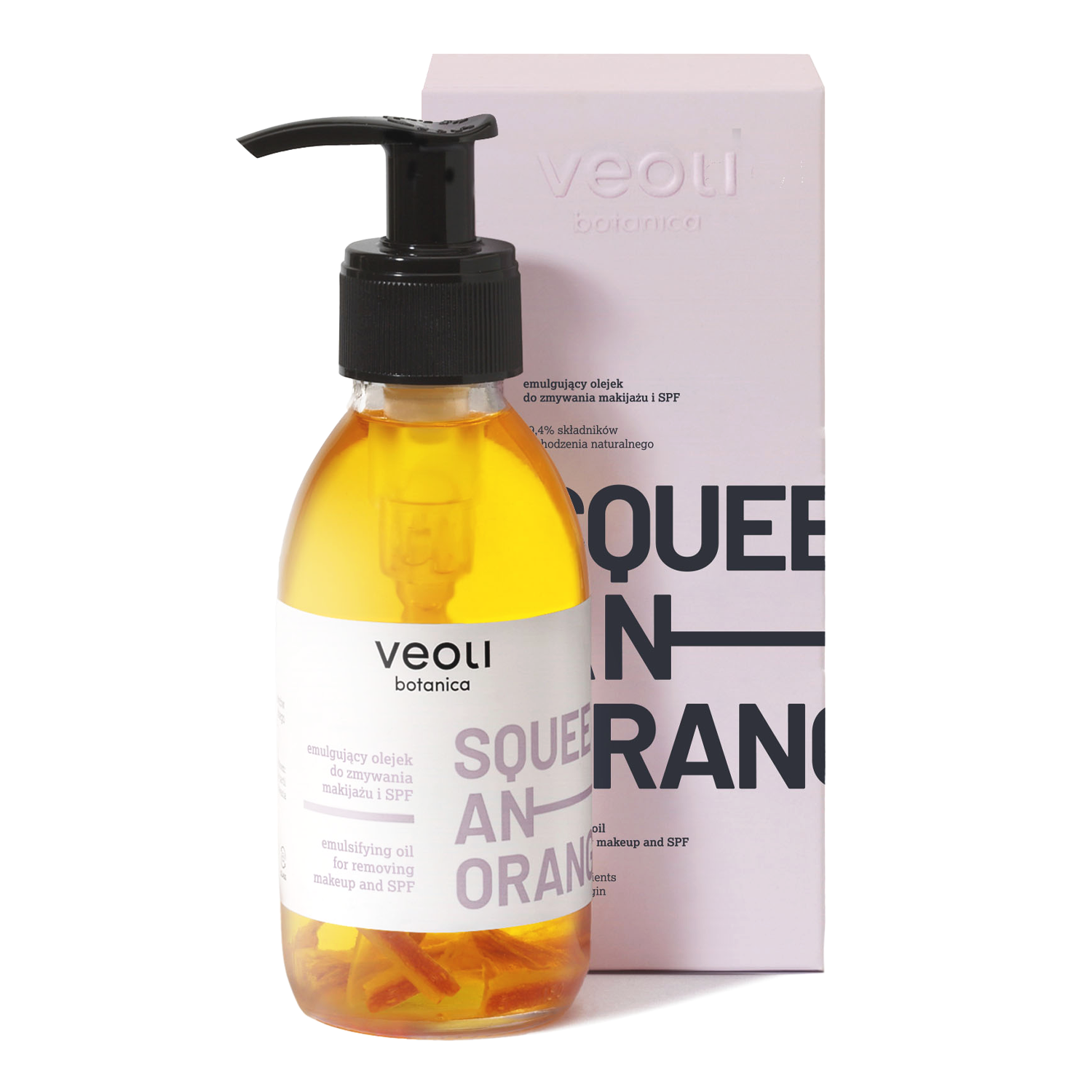 Veoli Botanica - Squeeze an Orange - Emulguojantis Aliejus Makiažui ir SPF Pašalinti – skirtas pirmajam odos valymo etapui, t. y. makiažo pašalinimui. Pašalina makiažą, nešvarumus, sebumą ir apsauginių kremų nuo saulės likučius. Jam būdingas energizuojantis apelsinų kvapas, o aliejuje yra apelsinų gabalėlių. Sudėtyje yra emulgatorius, kuris palengvina aliejaus pašalinimą nuo odos. Vertingi aliejai, tokie kaip jojobos aliejus, šaltalankių aliejus ir argano aliejus, rūpinasi odos regeneracija, elastingumu ir maitinimu. Vynuogių kauliukų aliejus tinka riebios ir mišrios odos priežiūrai, veikia prieš spuogus, o sezamų aliejus veikia apsauginiai ir nuo senėjimo. Šie aliejai stiprina odos lipidinį barjerą, palieka odą lygią ir sudrėkintą. Kosmetikos priemonėje yra 99,4% natūralios kilmės ingredientų, ji yra veganiška ir atitinka less waste principus.