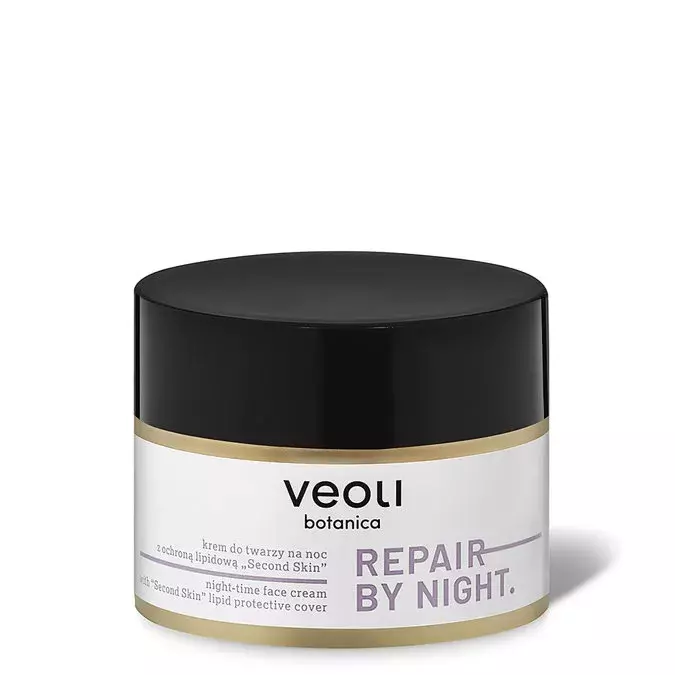 Veoli Botanica - Repair By Night - Night-Time Face Cream with "Second Skin" Lipid Protective Cover - Naktinis Veido Kremas su Lipidine Apsauga – intensyviai maitinantis kremas, pasižymintis turtinga konsistencija. Dėl gausybės aliejų ir augalinių ekstraktų jis stipriai puoselėja net labai išsausėjusią ir jautrią odą. Kremas turi regeneruojančių, maitinančių ir raminančių savybių. Tai puikus antioksidantų šaltinis, todėl palaiko nuo senėjimo apsaugančias funkcijas. Oda tampa lygi, švelni ir elastinga. Produktas sudarytas iš 97,8 % natūralios kilmės žaliavų, yra veganiškas ir atitinka less waste principus. Palieka apsauginę plėvelę ant odos.